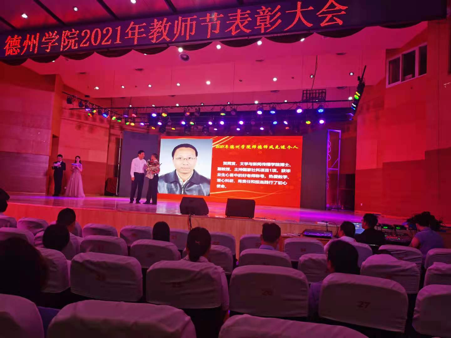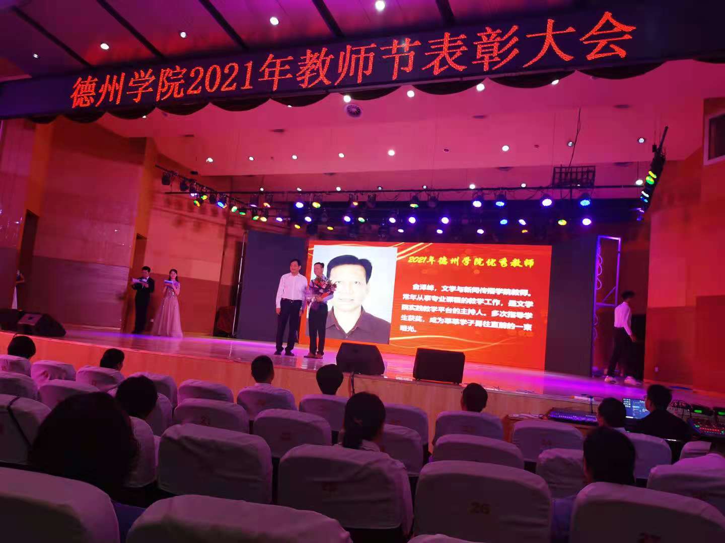 9日上午,在第37个教师节来临之际,学校在音乐厅召开2021年教师节表彰大会,表彰2021年英国正版365首页师德师风先进个人、优秀教师和优秀教育工作者。我院两位教师获学校表彰,贺同赏老师获得2021年英国正版365首页师德师风先进个人称号,俞泽峰老师获得2021年英国正版365首页优秀教师称号。他们表示教师不仅传道授业解惑,更应致力于学生品格、品行、品位塑造,要以高尚的职业道德铸魂育人,以深厚的专业素养诲人不倦,努力向着“四有”好老师这个目标奋进。我院新入职教师庄严宣誓,表达要忠诚党的教育事业,努力做一名大学好老师。