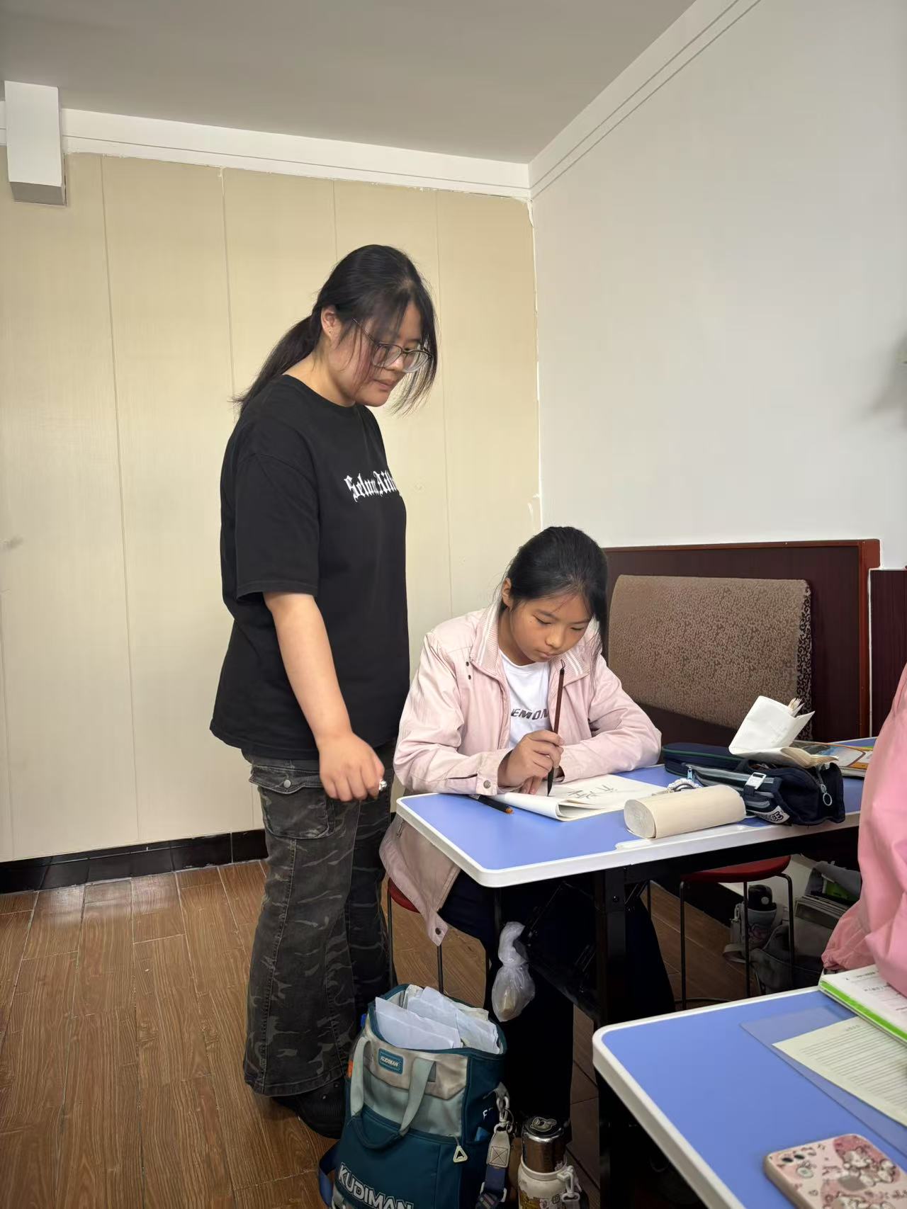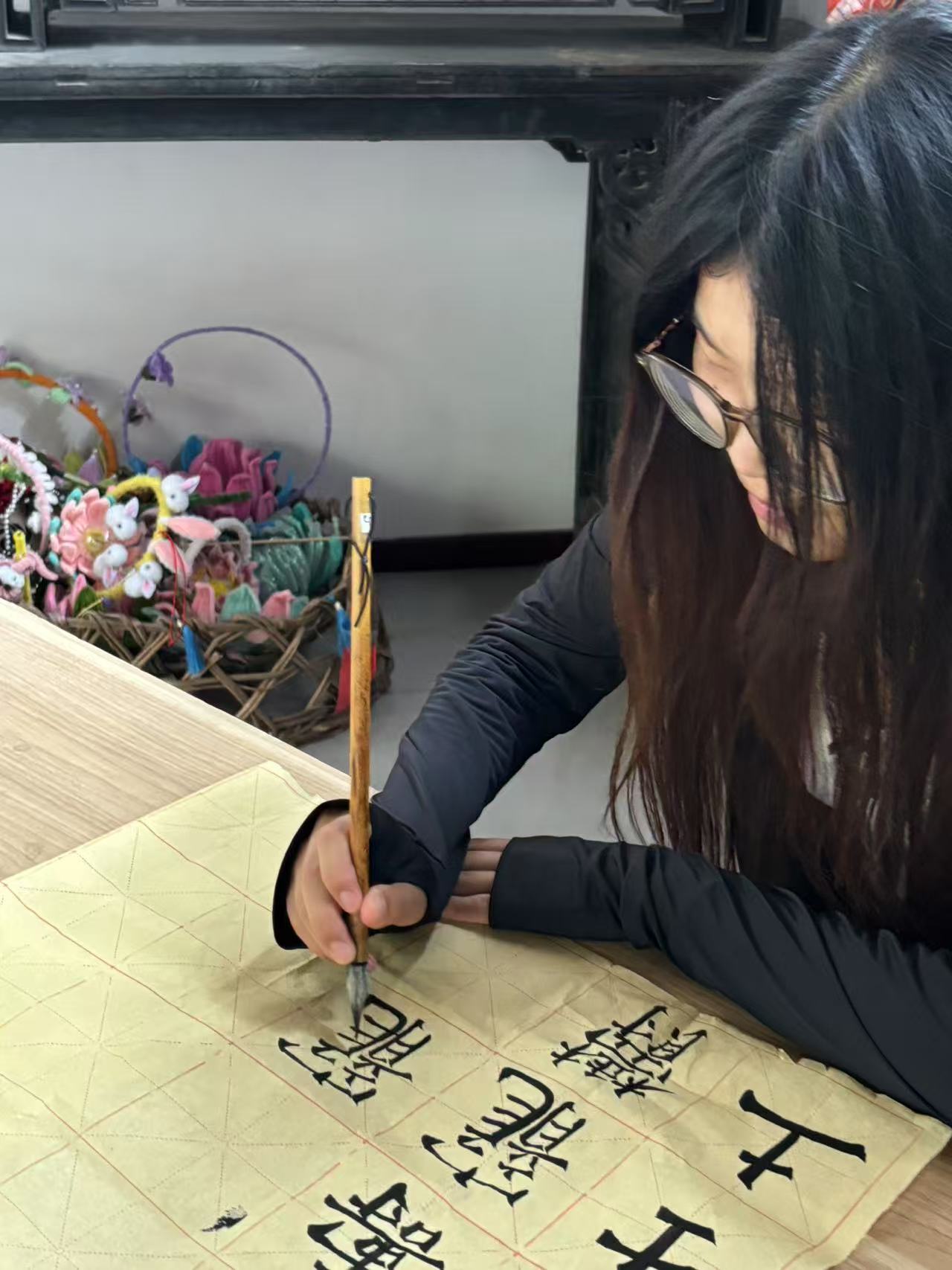 活动中,团队首站抵达城阳街道大湖村,聆听当地长者讲述莒国人文历史,从口述史中梳理文化脉络。成员们深入莒国古城开展调研,在非遗展区,栩栩如生的剪纸、古朴典雅的瓷器令大家驻足赞叹;书法体验环节更是掀起实践高潮,成员们分组行动,或研习莒县书法演变历程,或与爱好者切磋技艺,或在老师指导下提笔临摹,在笔墨纵横间体悟文化精髓。古城内互动频频,团队成员以影像记录、实物观摩、亲身体验等方式,多维度感知莒文化的深厚积淀。期间,实践团还特别开展了“文化进社区”服务,为当地居民举办非遗知识小讲堂,居民们热情参与,与同学们共同探讨传统文化保护的新方法,现场气氛热烈融洽。