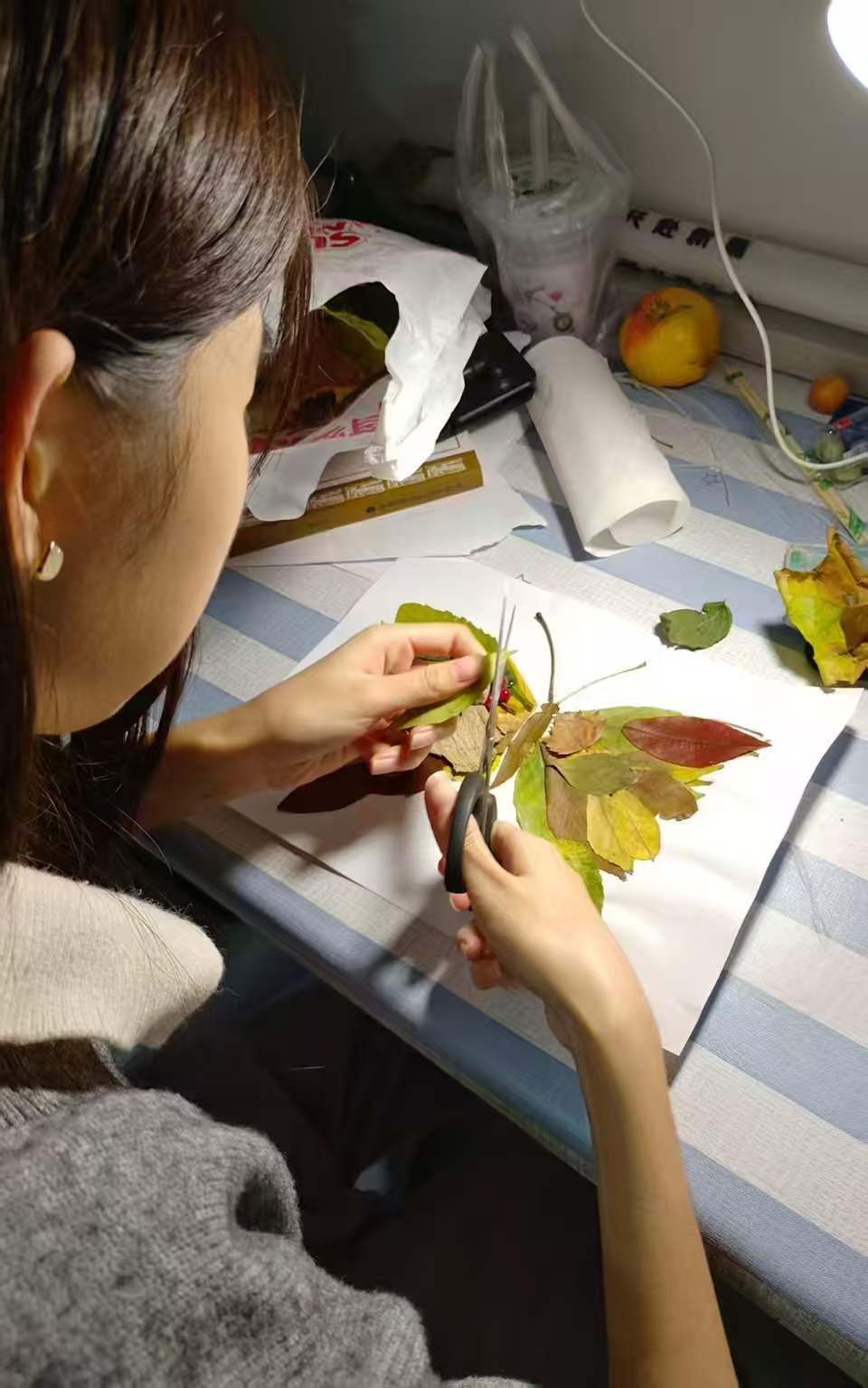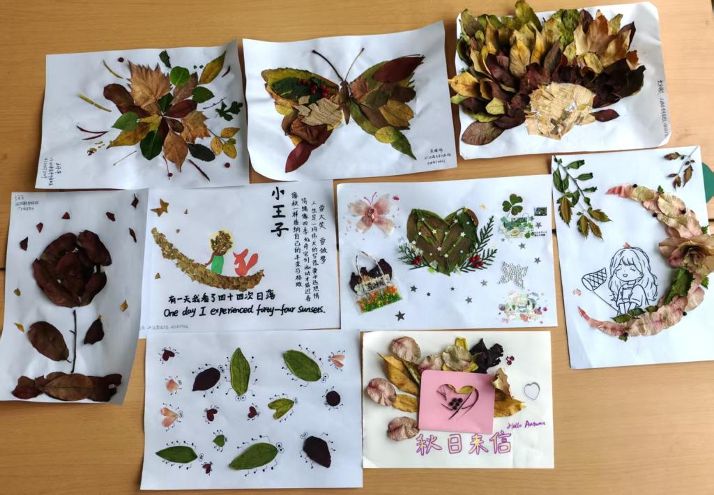 活动期间,同学们化身“秋日收藏家”,在校园里捡拾红枫、银杏叶、松果等素材,结合自身审美创作出叶脉书签、拼贴画、挂饰等作品。这些作品裹着秋日草木香,既有青春创意,又显实践热情,传递出健康向上的风貌。创作结束后,同学们互相交流,在分享中加深对自我情绪的理解,也增进了彼此的情谊。