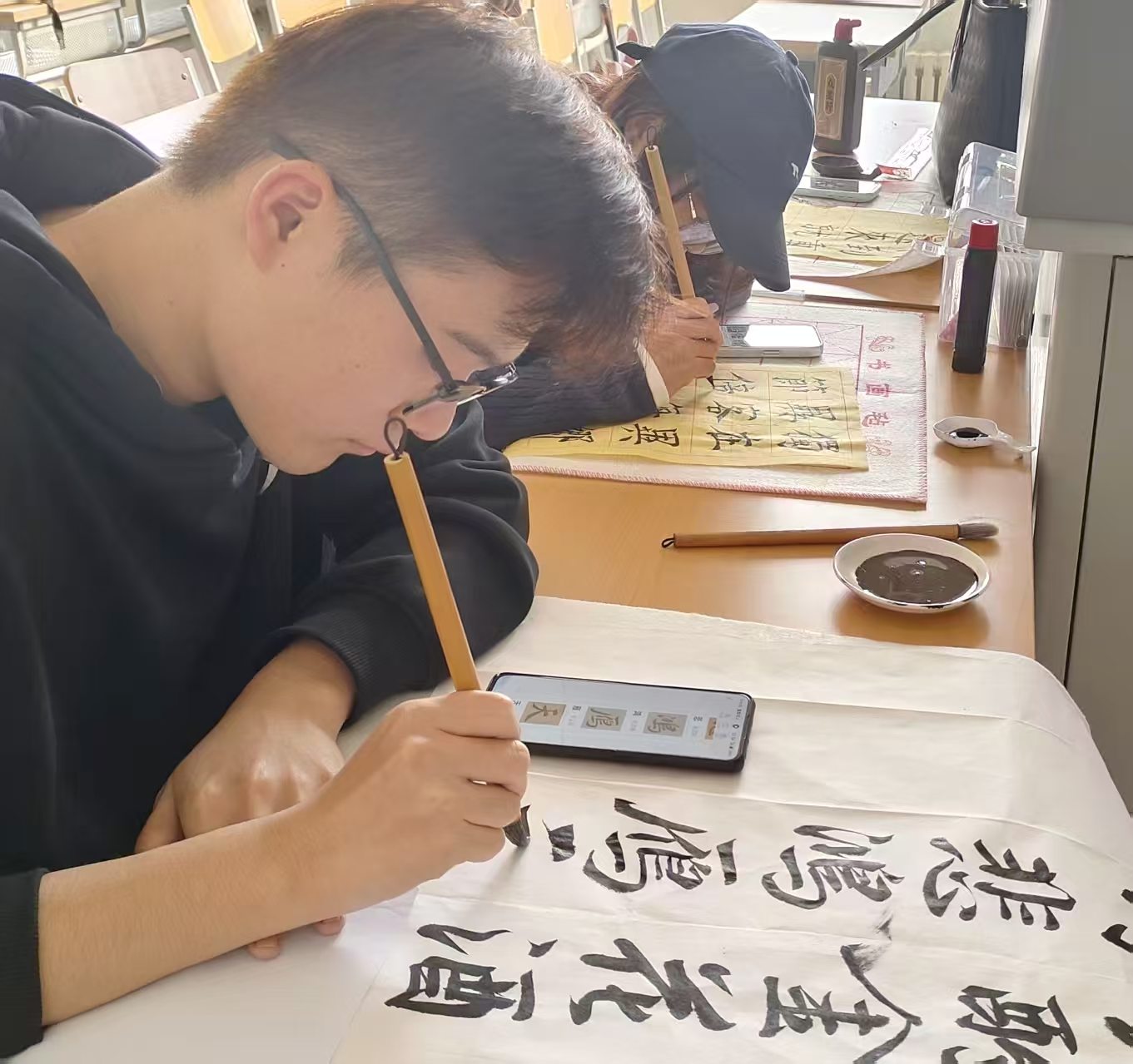 独在异乡为异客,每逢佳节倍思亲。同学们以笔墨为媒,围绕重阳经典诗词、敬老寄语等内容进行书写,传递节日温情与文化内涵。纸页间,不同书体各具风骨,每一笔墨痕都承载着同学们对传统文化的理解与共鸣。书法艺术与重阳意蕴相融合,展现出传统节日在当代校园中的生动诠释。