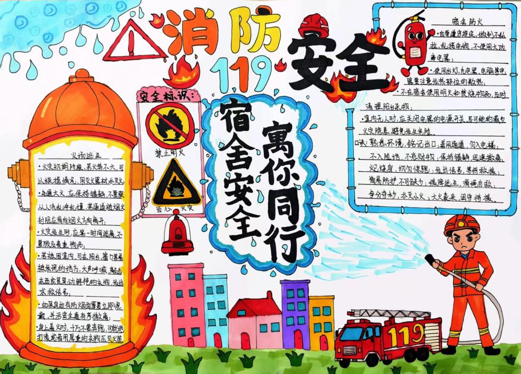 在活动期间,同学们围绕“宿舍违规电器危害”“火灾逃生技能”“消防器材使用规范”等主题进行了创作。短视频作品通过自编自导的微剧情,生动展现宿舍消防隐患的防范方法,兼顾趣味性与科普性;手抄报作品以手绘漫画和醒目警示标语相结合,将安全知识转化为具体行动指南;板绘作品则运用高饱和度色彩突出视觉重点,将“禁止私拉电线”“不占用消防通道”等安全规范以直观图像呈现,增强知识的表现力与记忆点。同学们在展示与交流中各抒己见,各类特色作品共同构筑起宿舍安全的生动风景。
