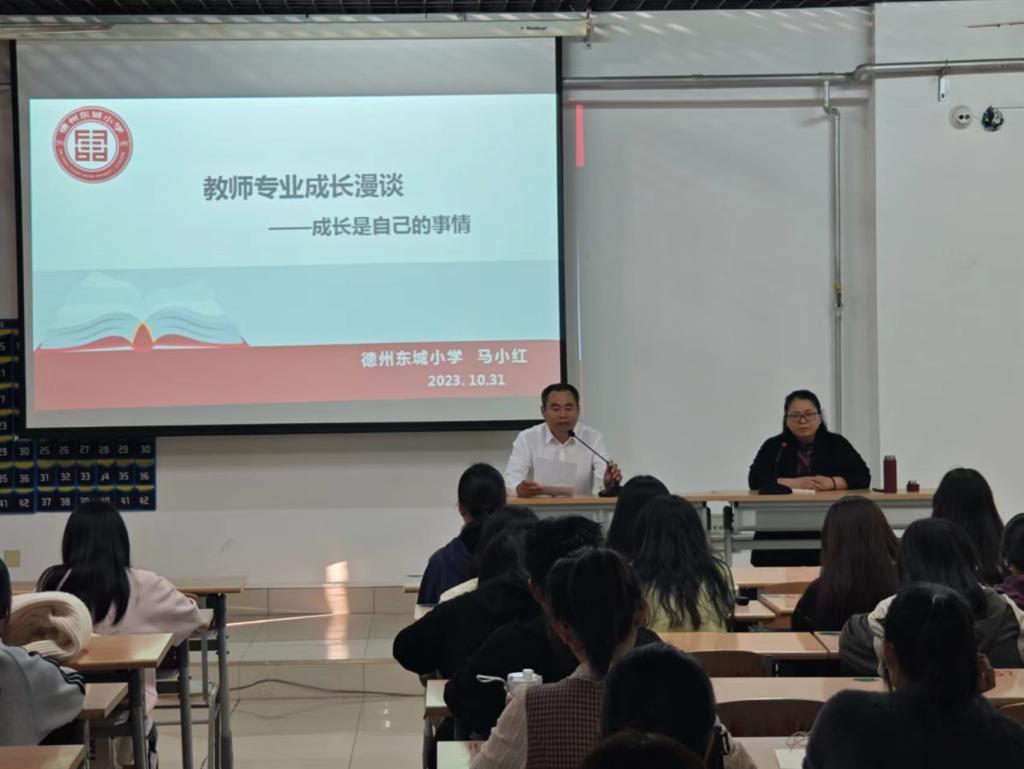 讲座邀请了德州市东城小学的马小红校长主讲,马校长围绕习近平总书记对建设教育强国的重要论述的解读、教师职业规范、新课标视野下教师能力需求、教师自主成长密码四个方面展开讲解,对当今教育强国的重要任务和意义、教育的有效方式、教师工作新要求进行了详细论述,让学生更加明确教师的职业需求和努力的方向。马校长的讲座内容丰富,结合案例,深入浅出,形象生动。在座的师生认真听讲,积极参与互动,并且踊跃回答问题,现场气氛热烈。