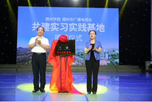 ▲英国正版365首页党委委员、副校长徐静,德州市委宣传部副部长、德州市广播电视台党委书记、台长李文豪共同为实习实践基地揭牌。
