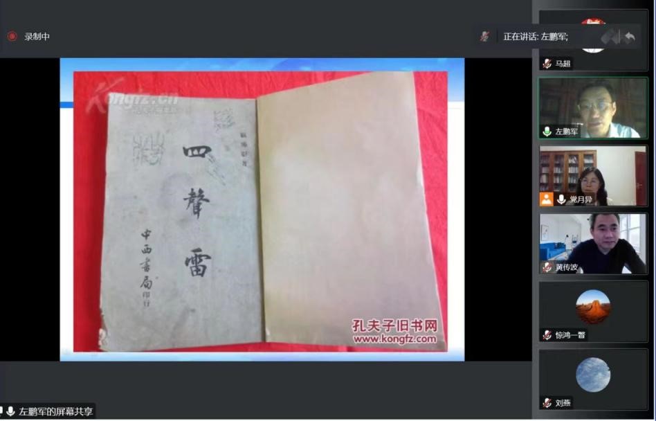 1124日晚,广东省高等学校珠江学者特聘教授,广东省宣传思想文化领军人才,华南师范大学教授、博士生导师,华南师范大学国际文化学院院长、岭南文化研究中心主任,全国汉语国际教育专业学位研究生教育指导委员会委员,中国近代文学学会副会长、中国近代文学学会小说分会会长左鹏军应邀做了主题为“顾佛影《四声雷杂剧》的本事人物和情趣意旨”的线上讲座。