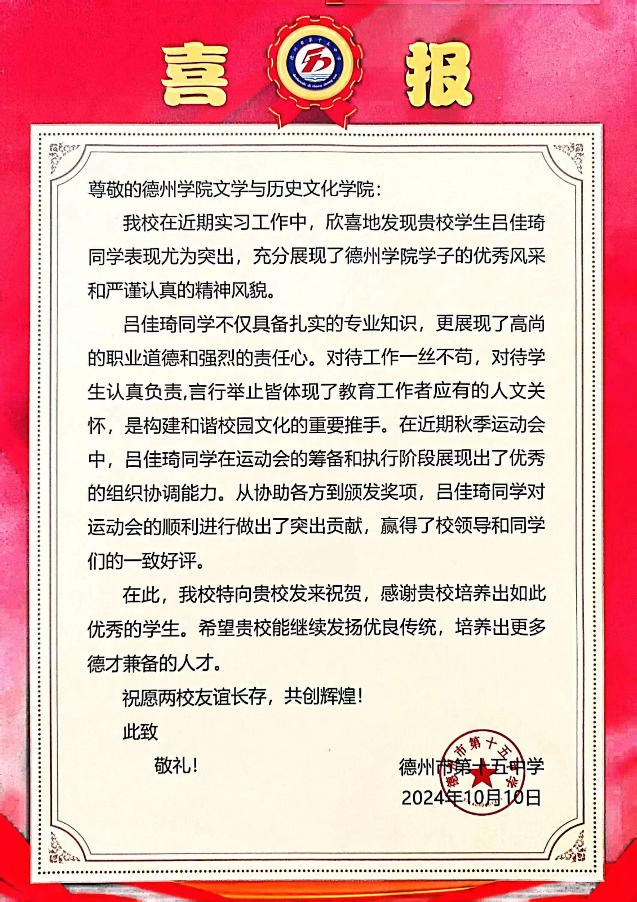 10月31日 ,德州市第十五中学党支部书记、校长董健一行人到访365上市公司,向在教育实习中表现优秀的我院学子赠送喜报。学院党委书记仲冲,党委副书记、副院长黄传波,学生指导老师陈雪,辅导员沙彦君接待。双方在博文楼329会议室座谈交流。