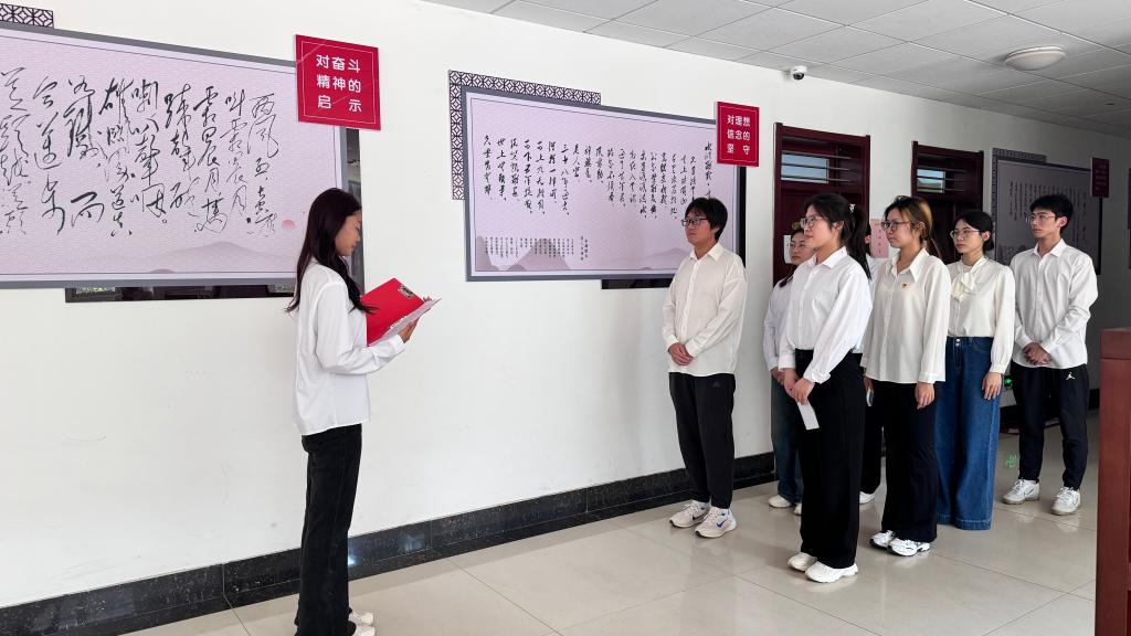 学生党员们以饱满的热情集体朗诵了《沁园春·长沙》和《七律·长征》两首经典诗词。在铿锵有力的朗诵声中,革命英烈们到中流击水,浪遏飞舟的豪迈气概和红军不怕远征难的大无畏精神深深感染着在场的每一位党员。朗诵结束后,一场“行走的党课”随即展开,学生党员代表结合诗词创作时的革命背景,生动讲述了两首诗词背后的党史故事,将诗词中蕴含的革命理想与斗争精神娓娓道来,让红色记忆在新时代焕发新的生命力。
