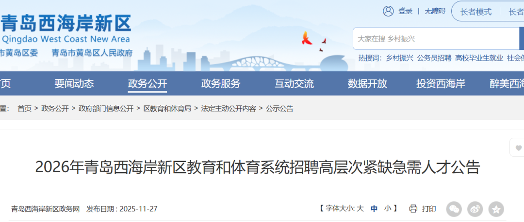 根据《事业单位人事管理条例》(国务院令第652号)、《事业单位公开招聘人员暂行规定》(人事部令第6号)等文件要求以及省、市有关规定,2026年青岛西海岸新区教育和体育系统招聘高层次紧缺急需人才120人,现将有关事项公告如下。